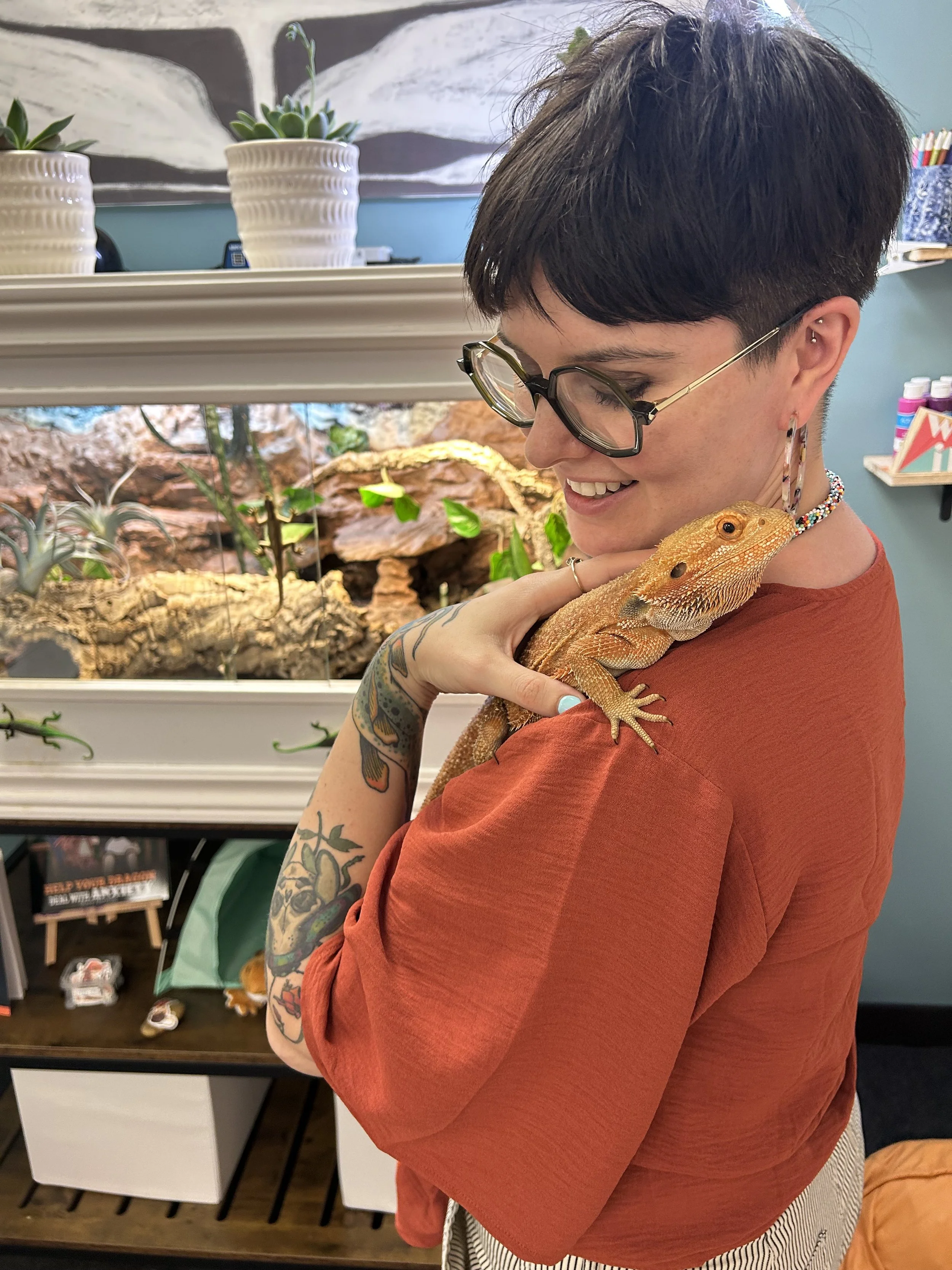 When he’s not lounging under his heat lamp, you might find him perched happily on a shoulder, taking in the view, or going on a treasure hunt through the therapy room with curious delight.